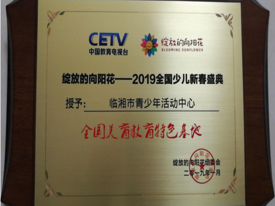 “绽放的向阳花”2019全国少儿新春盛典由中国教育电视台早教频道主办,该活动旨在发展我国少年儿童美育事业、繁荣少年儿童艺术创作、丰富少年儿童文艺交流,以少年儿童的生动活泼、独特的艺术感染力、朝气蓬勃的气势展现出少年儿童热爱祖国,热爱生活的积极态度。同时,助力全面推进素质教育,促进学校艺术教育工作的全面发展,不断提升少年儿童艺术素养,发掘和培养艺术新人,展示艺术教育成果。来自全国各地的71个不同类别的节目参演,戏曲课本剧《将相和》不负众望,获最佳表演金奖,同时,临湘市青少年活动中心被中国教育电视台“绽放的向阳花”组委会授予“全国美育教育特色基地”。