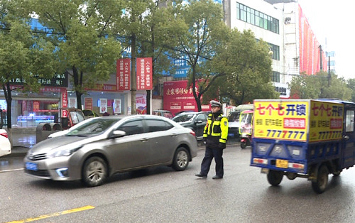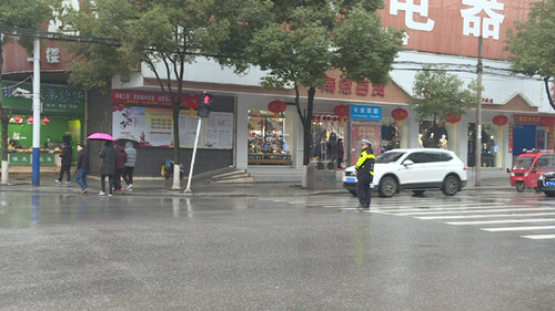在城区十字路口等交通繁忙的重点路段,交警们冒雨值勤,指挥交通,保证车辆有序通行。为了保证市民出行安全,市公安交警大队在重点路口增加警力,加强对主要道路、事故多发、易发路段等路段的巡逻管控力度。针对雨雪天路滑可能导致的撞护栏、车辆追尾、刮擦等情况,交警及时出警处理,疏通道路。