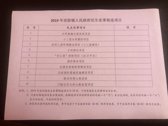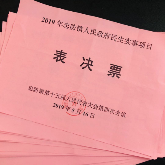 阶段,人大代表认真履行职责,以无记名方式填写表决票,并有序投入选举箱内。忠防镇2019年民生实事项目最终票决出8项,分别是沙坪集镇升级改造项目、小二型水库整险项目、农村人居环境整治项目(小三园建设)、乡村绿化项目、“空心房”拆除项目(10万平米)、厕所革命项目、双港村道路桥梁建设项目、马家洞村基础设施建设项目。