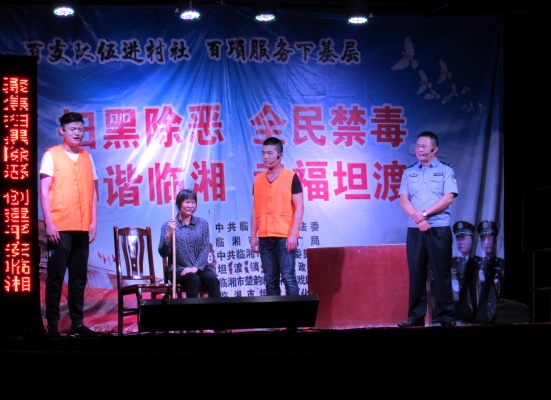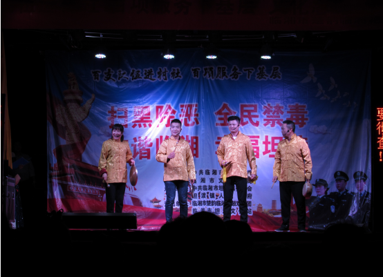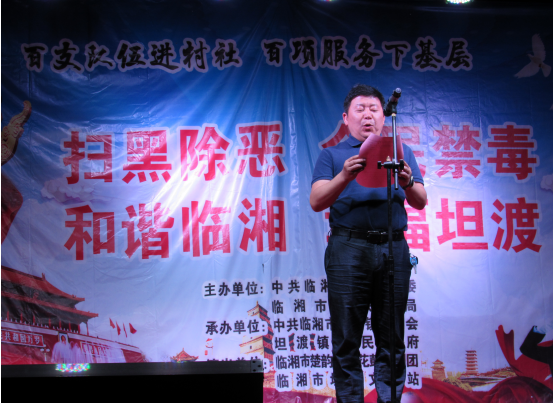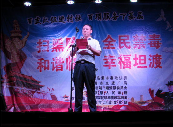 此次演出活动由中共临湘市委政法委、市文旅广电局举办,坦渡镇委员会、坦渡镇人民政府承办,市楚韵临湘花鼓戏剧团、坦渡镇文化站演出。19:30演出准时拉开帷幕,何卫华发表了热情洋溢的致辞,余汉平作了重要讲话。整场演出节目形式多样、内容丰富。伴随着一阵阵掌声,舞蹈《不忘初心 砥砺前行》、女声独唱《魅力临湘》、方言三句半《铲黑除恶扬清风》、新潮快板《扫黑除恶就是好》、禁毒小品《娘亲》等十几个节目先后呈现,为观众送上了一场视听盛宴。