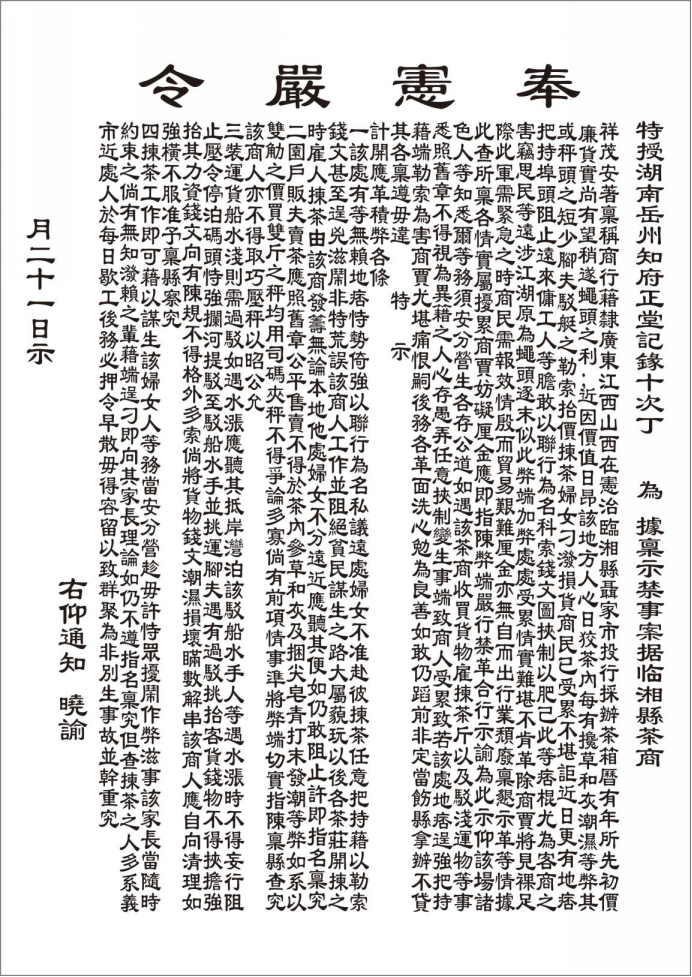 三、官府“重视茶业,法治茶市”的知政举措可见一斑。茶市的兴盛带来百业繁荣,同时也引来诸色等人,扰乱市井,造成茶市秩序混乱,原本也是司空见惯。但官府视茶事之殊,民生事关之大。否则,一省之宪,不会如此兴师动众,对聂家市一个区区茶埠码头的茶事,特地颁发禁令,立碑布告,以禁后患。可见当时各级官府对茶业之重视,茶市管控之严谨,营商环境之和谐。这也正是聂家市茶业兴盛之根本。不然,祥茂安等外来茶商在聂家市古镇业茶生财,也不会“历有年所”而信心不减。
