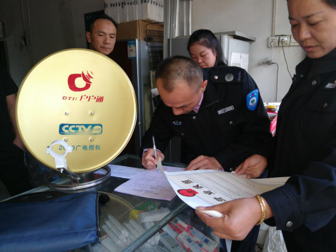 执法人员在家电维护店开展卫星地面接收设施专项整治行动