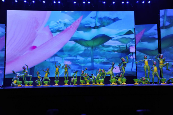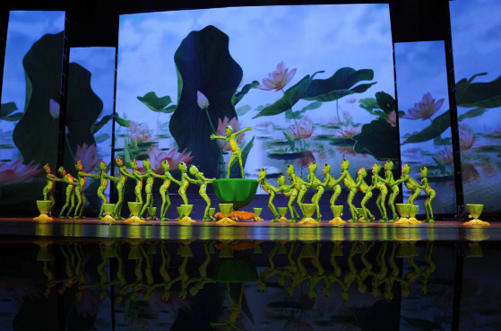 观赏这个舞蹈给人以美的享受,大幕拉开,青蛙们潜伏在水田里、池塘边、草丛中,刚开始,听见一只在“呱—呱呱”地鸣叫,仿佛是在独唱;接着是三两声,一唱一和;不一会儿,三只、四只合唱;紧接着“呱!呱!呱!”无数只青蛙齐鸣,叫声此起彼伏,连成一片,满山、满谷、满丘……,敲响了蛙鼓,真有万鼓齐鸣之势。它们时而跳跃,时而翻滚,时而低吟浅唱,时而引亢高歌,时而轻松欢快,时而激情澎湃,这蛙鼓声声,宏大如乐团一般,使得天地蓝了,水也清了,连这剧院四周的夜色,也淡若墨影了!