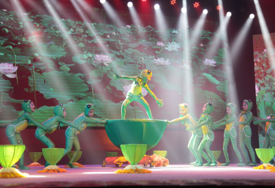 少儿舞蹈节目《蛙鼓声声》由临湘市文化馆舞蹈老师唐佳丽、孙霞创作编排,作品以拟人手法表现青蛙在自然环境生存中“一鼓作气、偃旗息鼓、重振旗鼓”三大生态环境变化过程,寓意自然环境遭到破坏后人类已经觉醒,歌颂了人们在日益发展中重视生态环境的重要和对生物链的保护意识。