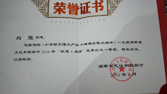 (孙 霞)11月25日,市文化馆非遗专干刘莹接到了来自省文化和旅游厅寄来的奖证。在省文化和旅游厅举办的“非遗+旅游”主题征文活动中,经专家评审,全省共选出一等奖5篇、二等奖10篇、三等奖10篇。市文化馆非遗专干刘莹撰写的论文《小浮标引爆大产业 小城镇承载大融合》,荣获湖南省文化和旅游厅2019年“非遗+旅游”优秀论文一等奖。