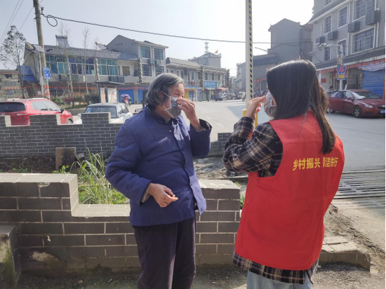 “奶奶,现在疫情严重,出门一定要戴上口罩呀。”忠防镇青年女干部易淑慧正在劝导外出民众带好口罩,并对防疫工作进行宣传。