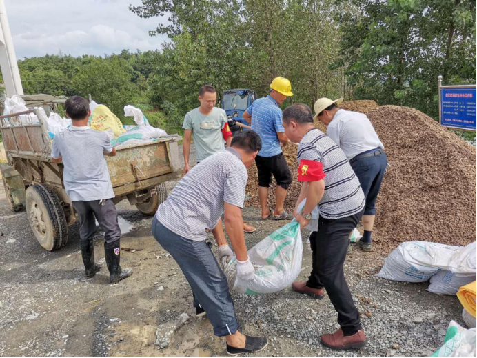 临湘文化旅游广电局抢险救灾突击队员正在搬运沙石