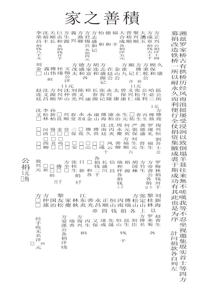 “积善之家”碑文记:“溯兹罗家桥,古有拱桥,历经风雨浪击,屡受浸润,以致倒塌,羊聂往来,无不嗟叹。我等不忍坐视,邀集殷富首士等四方募捐,改造铁桥一所,以耐永久而利便行。全仗捐资,集腋成裘,于斯为功,有其此也。是为序。”