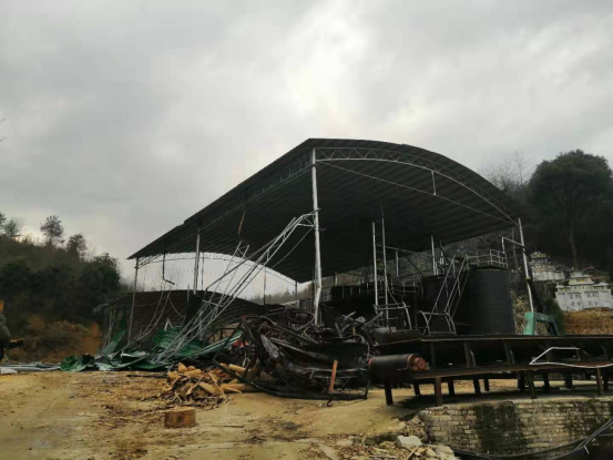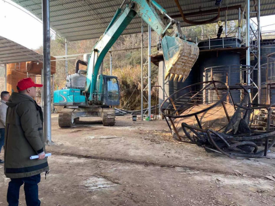 据悉,樟树油为提炼冰毒原材料之一,该非法樟树油加工厂于去年10月份建成,厂房是简易搭建的钢架棚,未办理任何手续,建厂过程中林业、城建、环保、国土等相关职能部门曾多次责令其停止违法行为,并下达停建拆除通知书,但该企业主受利益驱使,仍进行非法生产活动,产生的有害气体和废水随意排放。为打击非法生产企业,保护绿色生态环境,忠防镇严格落实上级部署要求,出动车辆6台,人员26人,采取分组行动方式展开行动,现场稳控组负责现场人员稳控,避免产生人员冲突和安全事故,机械拆除组负责拆除厂区内所搭建的管线结构、连通设备和违规结构大棚。
