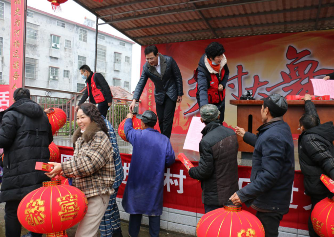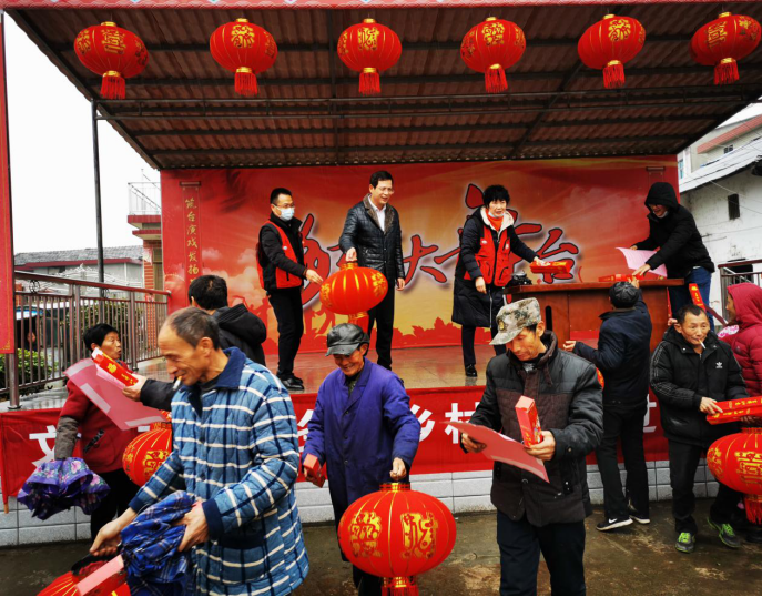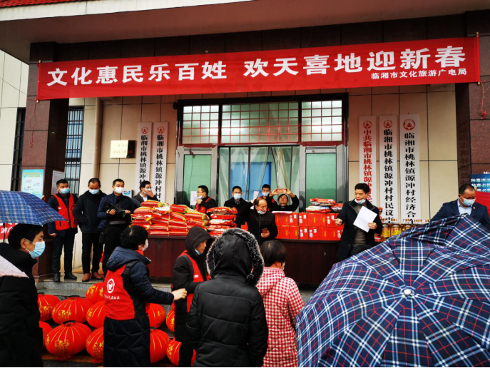 活动当天正值农历小年,临湘市文旅广电局党组书记、局长陆如勇率局班子成员及局直二级机构负责人冒雨来到现场,将裹满“年味”的春联及物质送给乡村百姓。