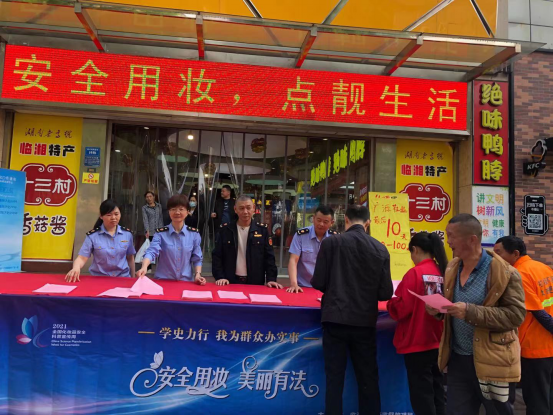 为加强《化妆品监督管理条例》等法规规章的宣贯,有效提升公众对化妆品安全的认知水平,引导消费者科学合理地使用化妆品,5月24日-5月31日,临湘市市场监督管理局在富食村购物广场开展为期一周的“安全用妆、美丽有法”化妆品科普知识现场咨询活动。