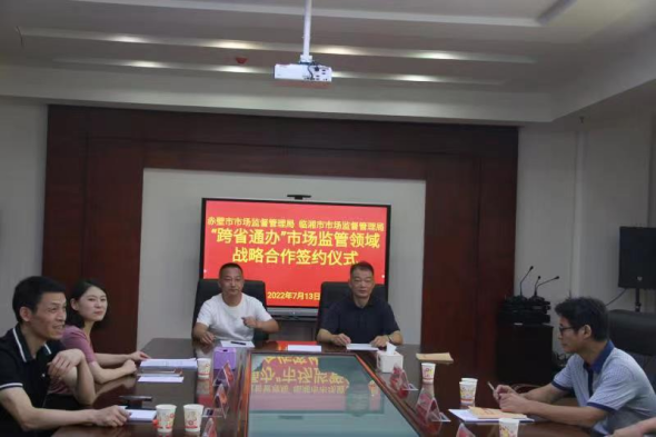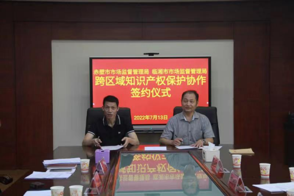 7月13日上午,临湘市市场监管局与赤壁市市场监管局签订“跨省通办”市场监管领域战略合作协议,和跨区域知识产权保护协作协议。签约仪式上,两地市场监管部门围绕如何优化市场准入、开展市场监管领域“双随机一公开”监管、加强知识产权保护等进行了深入交流。