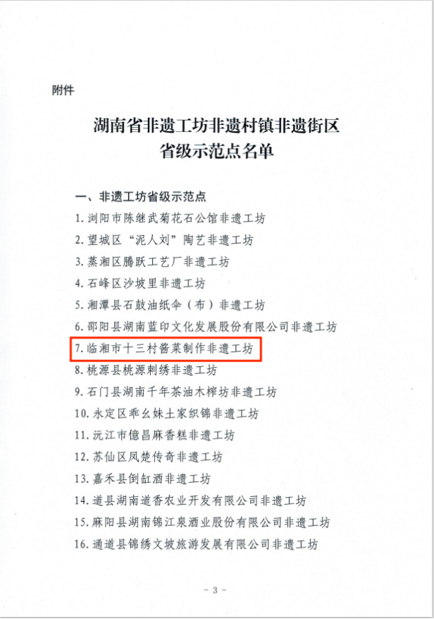 近日,湖南省文化和旅游厅印发了《关于公布非遗工坊非遗村镇非遗街区省级示范点名单的通知》,公布了临湘十三村酱菜制作非遗工坊等20家达到省级示范标准的非遗工坊为非遗工坊省级示范点。