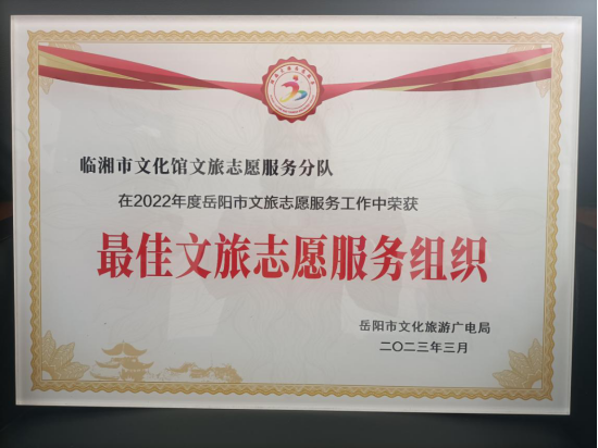 (刘莹)近日,岳阳市文旅广电局印发《关于表彰2022年度岳阳市文旅志愿服务工作的通报》,临湘市文化馆荣获最佳文旅志愿服务组织奖。