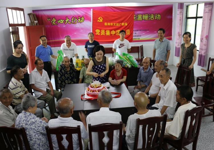“祝你生日快乐,祝你生日快乐……”一阵阵温婉柔和的歌声在临湘市五里牌街道办事处敬老院里悠然飘出,正在切生日蛋糕的寿星陈光明爷爷激动得热泪盈眶地说:“活了77年没有人为我做过寿,今天真是让我终身难忘啊!”8月10日,中共临湘市文化旅游广电新闻出版局机关支部委员会创新“党员活动日+”形式,在副局长汪军红、张国良、丁清利、工会主席龙慧的带领下,顶着夏天的炎热,不辞辛苦,带着一车美味香甜的水果、大米、食用油、生日蛋糕等来到五里敬老院看望孤寡老人,给他们送去了慰问品,送去了爱心和温暖。