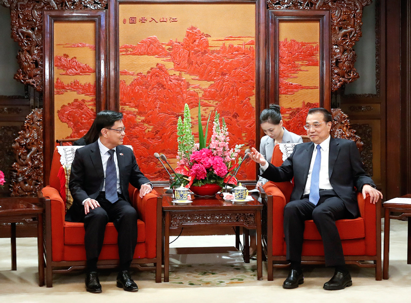 李克强表示,当前中新关系发展势头良好。中方愿同新方继续密切高层交往,将“一带一路”倡议同新方发展战略更好对接,发挥好两国副总理级双边合作机制作用,推进“陆海新通道”和第三方市场合作,深化贸易投资、金融、智慧城市以及中国地方省市同新加坡的合作,推动两国关系与合作再上新台阶。