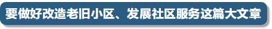 李克强来到拱墅区和睦新村,走进居民家中关切询问老人照护、幼儿入托等情况,在社区考察居家养老服务项目。他说,居家和社区养老服务需求巨大,要大力引入社会力量增加供给,政府要加大支持,让老人过上舒适安康、快乐幸福的生活,这也让年轻人对未来充满信心。民生选项有很多,还要大力发展社区托幼、家政、助医等服务。正在休闲的老人们告诉总理,这里实施了老旧小区改造,生活环境好多了,但还希望为老楼房加装电梯。李克强说,建设宜居城市首先要建设宜居小区。改造老旧小区、发展社区服务,不仅是民生工程,也可成为培育国内市场拓展内需的重要抓手,既能拉动有效投资,又能促进消费,带动大量就业,发展空间广阔,要做好这篇大文章。