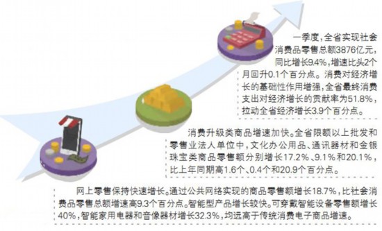 虽然增速放缓,但一季度我省消费升级趋势明显,发展型、改善型、康乐型消费快速增长,消费结构持续优化升级,消费方式不断创新发展,消费领域新旧动能转换稳步推进。