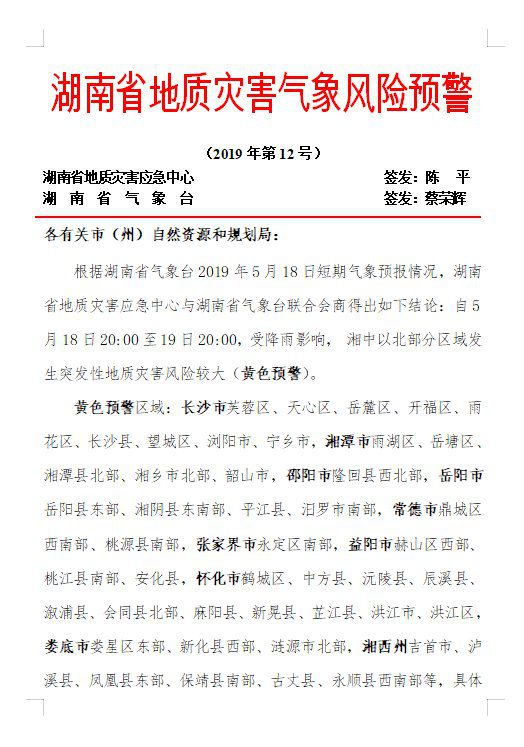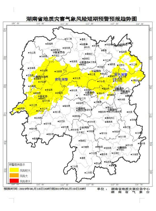 记者昨日从省气象台获悉,根据湖南省气象台2019年5月18日短期气象预报情况,湖南省地质灾害应急中心与湖南省气象台联合会商得出如下结论:自5月18日20:00至19日20:00,受降雨影响,湘中以北部分区域发生突发性地质灾害风险较大(黄色预警)。