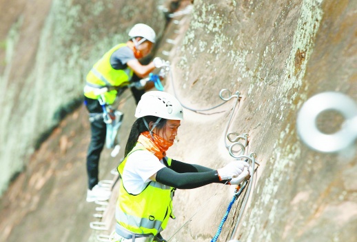 7月3日,慈利县红岩岭户外拓展运动基地,工作人员在检查爬山径道上的攀岩设施。进入暑期以来,该基地加大对钢索吊桥及崖壁爬山径道上的铁扶手横梯、固定缆索、岩石塞、踏脚垫等各类设施的安全检查和维护力度,建立健全应急预案,确保高危旅游项目设施安全。吴勇兵 摄