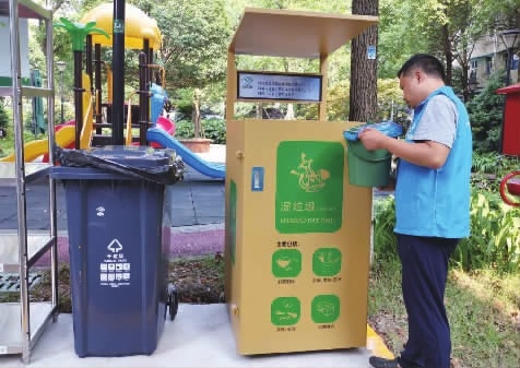 小区设置了生活垃圾定时投放点、分拣中心、垃圾存放场地,并给每户家庭配发了两个湿垃圾桶。