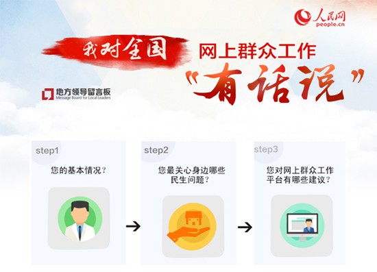 推动网上群众工作的发展需要与网民携手,共同努力。作为广大网民中的一员,您最关心哪些民生问题?您对全国网上群众工作有什么话说?欢迎参与“我对全国网上群众工作‘有话说’” 网民问卷调查活动,留下您的宝贵意见,为各地开展网上群众工作提供重要参考。