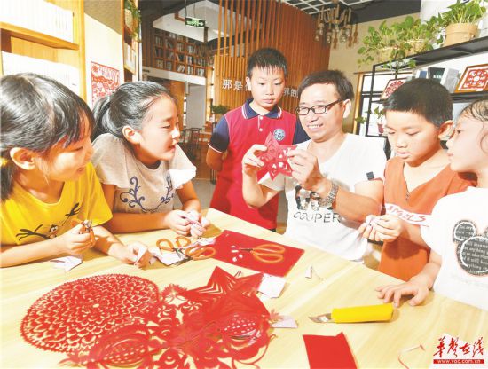 7月16日,长沙市雨花区止间雨岸书店,剪纸艺人教孩子们剪纸。该店是由长沙市剪纸协会打造的剪纸传承基地,于本月13日运行。目前,已推出了公益剪纸课堂、剪纸作品展、文化讲堂等系列文化活动,市民来这里可以参观、体验、学习剪纸技艺。湖南日报·华声在线记者 田超 通讯员 熊其雨 摄影报道