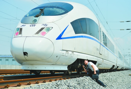 8月5日,长沙动车运用所,随车机械师冒着高温在检查车辆走行部情况。近段时间持续高温,该所随车机械师在车辆启动前,需在温度达40多摄氏度的股道上对车辆走行部、制动设备、高压设备等进行确认检查,把好行车安全最后一道关,确保暑运期间车辆平稳运行。 (记者 傅聪 摄)