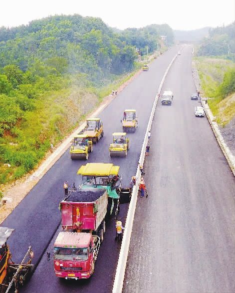 8月10日,娄底大道双峰县走马街镇水口村段,工人冒着酷暑在摊铺沥青。娄底大道起于双峰县城,止于新化县城新区,总长约116公里,总投资约31亿元,是湖南省重点建设项目。目前,娄底至涟源段已建成通车,冷水江至新化段和娄底至双峰段预计在9月30日之前建成通车。 李建新 摄
