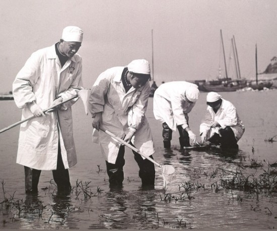 一张黑白照片里,四个身着白大褂、穿着雨鞋的人,拿着工具在脚下的水田取样。原来,这是岳阳县血吸虫病防治站医务人员检查灭螺情况的情景。