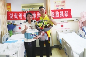 10月23日,中南大学湘雅二医院,22岁的邓应友(右)捐赠了造血干细胞后,与重庆白血病患者所在医院医生合影。邓应友10月26日收到了患者写的感谢信。他是名钢琴教师,三年前还在湖南科技大学就读时就曾捐过造血干细胞血样。为了千里之外的患者,他提前5个月做准备。图/受访者提供