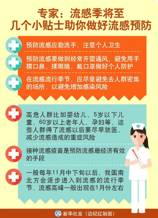 流感高发季节又要来了。有专家预测,随着气温降低,流感活动将开始逐步增强,我国将由北向南陆续进入流感流行季。