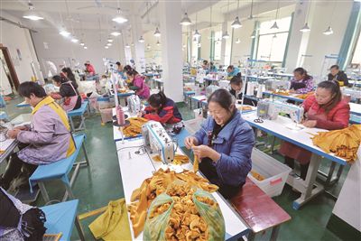 上图:12月14日,宁远县鲤溪镇易地扶贫搬迁安置点,村民在雷玄村就业扶贫车间加工服装。该镇80后大学生姜定财返乡创办服饰公司,帮助110余名贫困人员、残疾人员就近就业。本组照片均由湖南日报记者 李健 通讯员 乐水旺 摄影报道