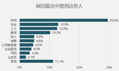 目前,《领导留言板》的网民身份呈现多元化趋势。根据抽样数据,留言中出现频次较高的是农民、学生、工人、教师等10类人群。其中,出现频次最高的是农民群体,占比29.5%。他们主要反映了精准扶贫、新农村建设、农民工就业等诉求。其次,学生、工人与教师群体的留言参与度也较高,出现的频次占比都超过10%(见下图)。