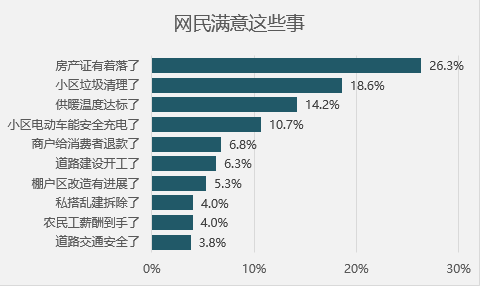 抽样数据显示,对于各级领导的答复,网民最满意的是盼望许久的房产证终于有着落了,这类评价占比26.3%(见下图)。