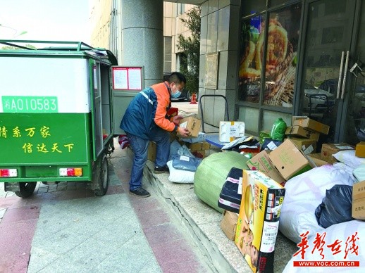 3月20日,长沙市庆和里,快递员正在整理等待派送的包裹。记者 黄亚苹 摄