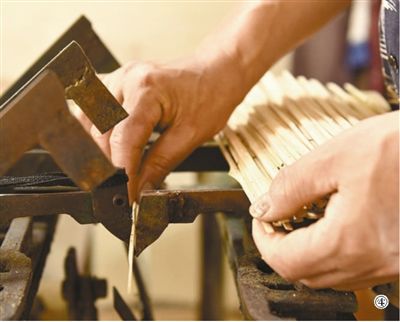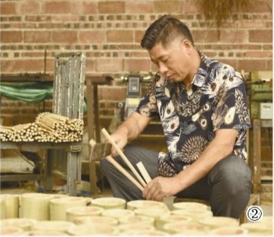 “咔嚓!”一声脆响,刚刮过青、正透着香的一截楠竹,应声被剖为两半。彭国亮拾掇起其中半边,顺着纹理,只稍稍地瞄了一眼,就又挥动柴刀连劈了五六下。手中的竹筒随即成了一根根小竹条。老彭拿手指一比划,不多不少,一条正好1.2厘米宽(图②)。