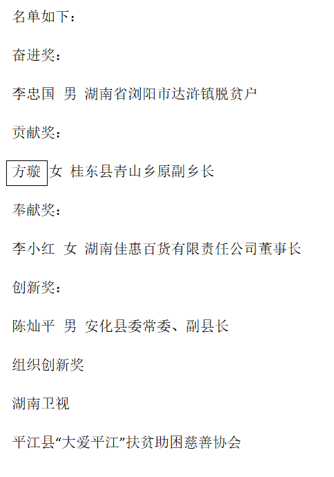 根据国务院扶贫开发领导小组印发的《2020年全国脱贫攻坚奖评选表彰工作方案》,经2020年全国脱贫攻坚奖评选委员会初次评审,共有142名候选个人和60个候选单位通过初评,并进行公示。湖南4名个人2个单位上榜,分别是:参评奋进奖的浏阳市达浒镇村民李忠国,参评贡献奖生前为桂东县青山乡副乡长的方璇,参评奉献奖的湖南佳惠百货有限责任公司董事长李小红,参评创新奖的安化县委常委、副县长陈灿平,参评组织创新奖的湖南卫视和湖南平江县“大爱平江”扶贫助困慈善协会。(记者 奉永成)