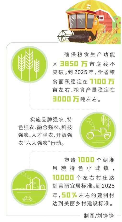 食为政首,粮安天下。《纲要》明确,确保重要农产品稳定供应。湖南坚持“藏粮于地、藏粮于技”,严守耕地红线,确保粮食生产功能区3850万亩底线不突破。到2025年,全省粮食面积稳定在7100万亩左右、粮食产量稳定在3000万吨左右。