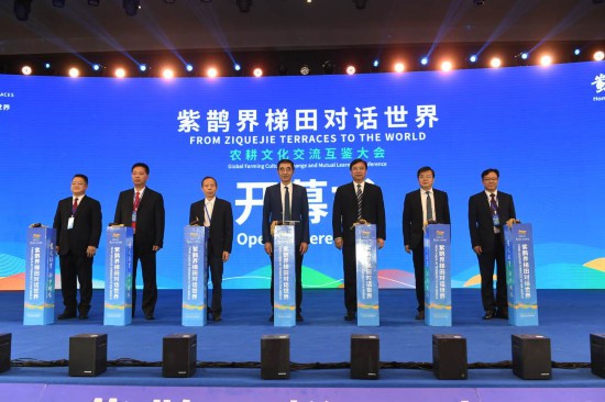 活动邀请了国内外与会嘉宾前往紫鹊界梯田考察,感受紫鹊界梯田发展特色,共同为“国际友谊心田”揭牌。
