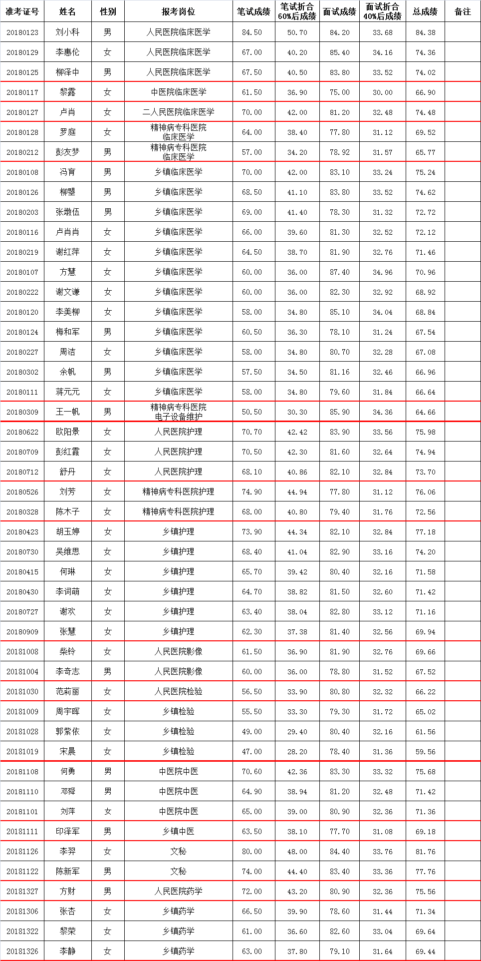 临湘市2018年卫计系统公开招聘工作人员笔试、面试结束,综合成绩已在临湘市政府网上公示。《临湘市2018年卫计系统公开招聘工作人员公告》规定:根据考生总成绩,从高分到低分(按招聘岗位计划1:1的比例)确定体检对象,如招聘总成绩相同的,按以下办法处理:同一岗位总成绩相同的以笔试成绩较高者优先;笔试成绩相同的,以学历层次较高者优先;再相同的,加考专业基础知识。依据这一规定,确定了本次招聘体检人员名单(详见附表)。现将体检有关事项通知如下: