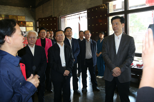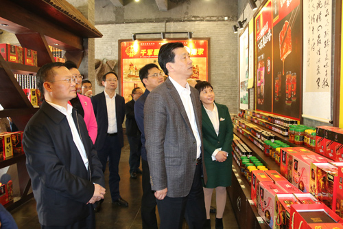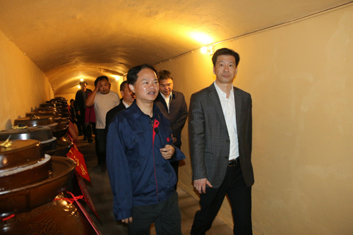 蔡振红一行边走边看,深入考察了十三村的先进食品生产线和加工模式、古香古色的工厂文化、历史悠久的窖藏文化和农耕文化、反映普通百姓幸福生活的“笑脸”文化等,并听取了李国武对十三村企业文化的详细介绍。