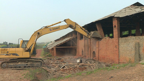 在拆除现场,两台挖掘机加足马力同时作业,一排排“空心厂房”在挖掘机轰鸣的作业声中应声倒下,拆除现场一片火热。