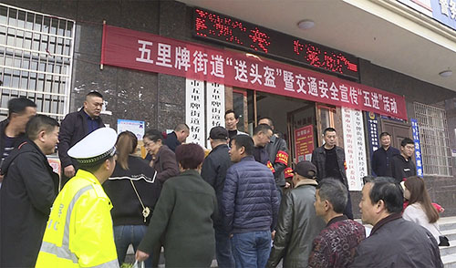 11月19日上午,五里牌街道组织开展“送头盔”暨交通安全宣传“五进”活动,为过往市民免费发放安全头盔,提高摩托车、电动自行车驾乘人员安全防护水平,让交通安全理念深入人心。