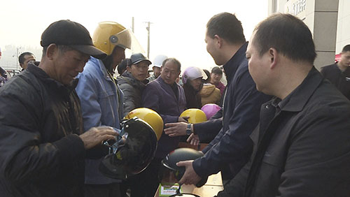 在白羊田镇白羊田社区活动现场,前来参加活动的村民自觉有序地排好了队伍。白羊田镇工作人员正为前来领取头盔的村民登记相关信息、签订承诺书和发放交通安全宣传资料,并向他们宣传了安全生产相关知识,引导他们严格遵守交通法规,养成文明出行的良好习惯。
