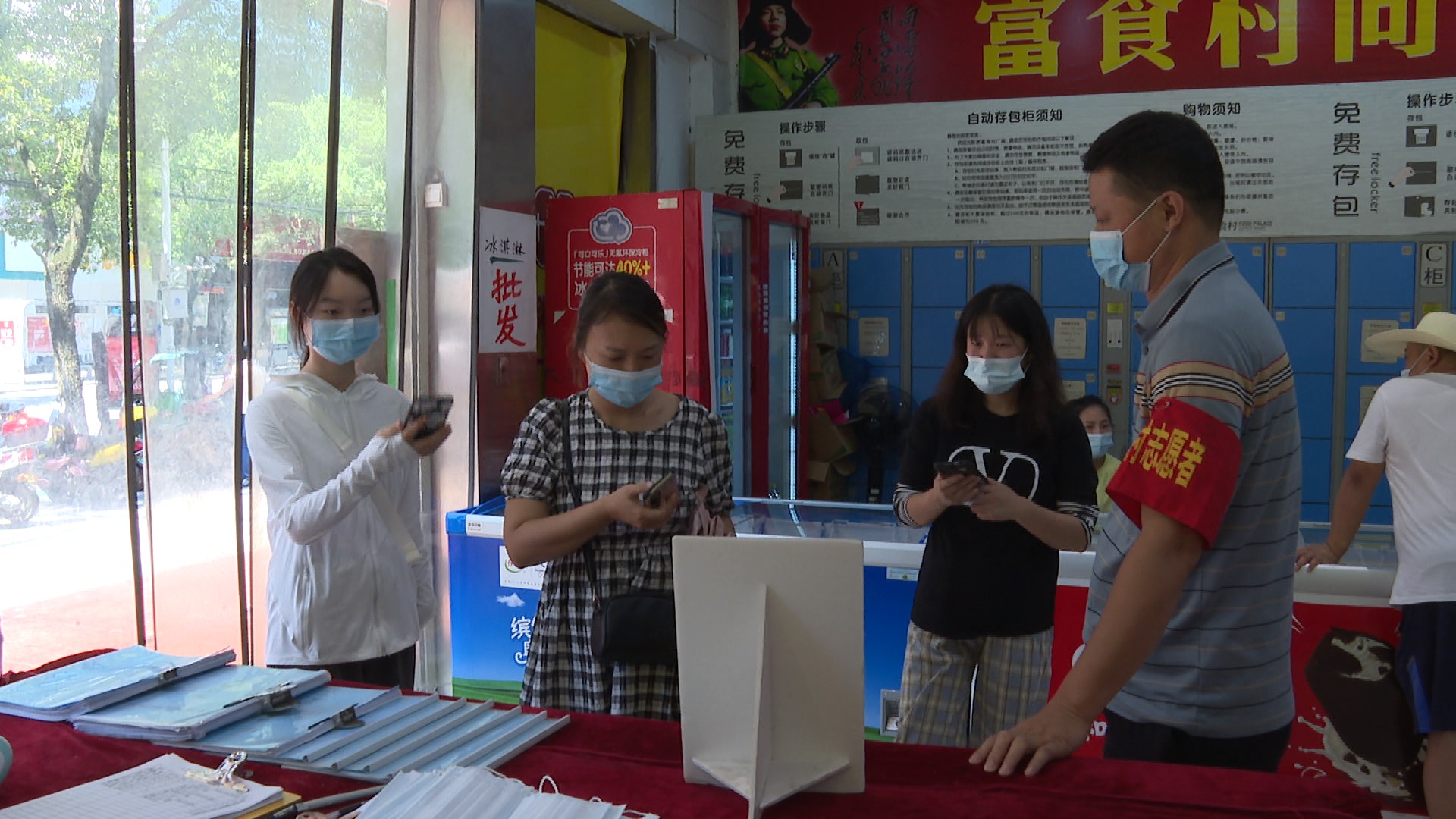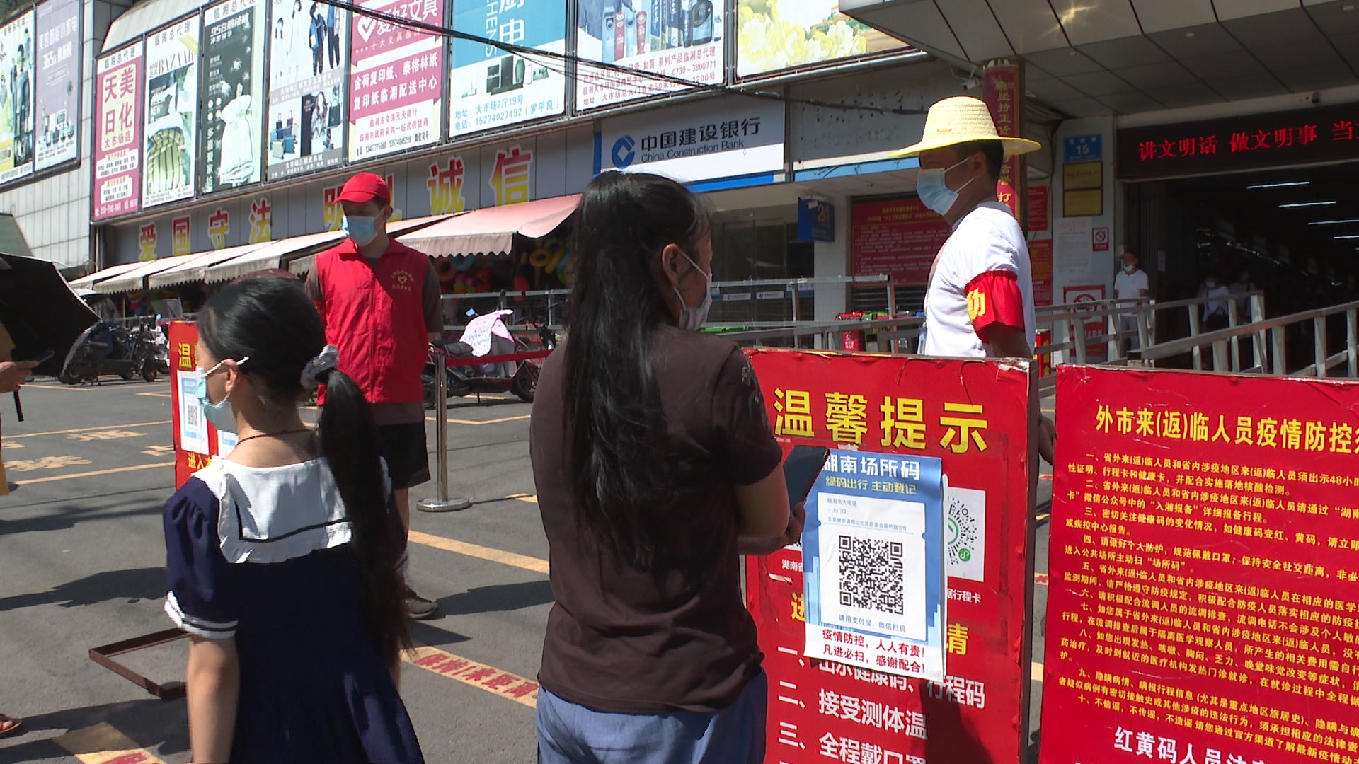 在大市场和新富食村购物广场,入口处均设置了体温监测仪和实时播报系统。前来商超采购的市民自觉佩戴口罩,在工作人员的引导下,积极配合出示行程码后,依次进入商超。