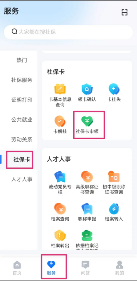 进入智慧人社APP,在下方引导窗口找到“服务”入口,点击“社保卡”事项,选择“社保卡申领”。