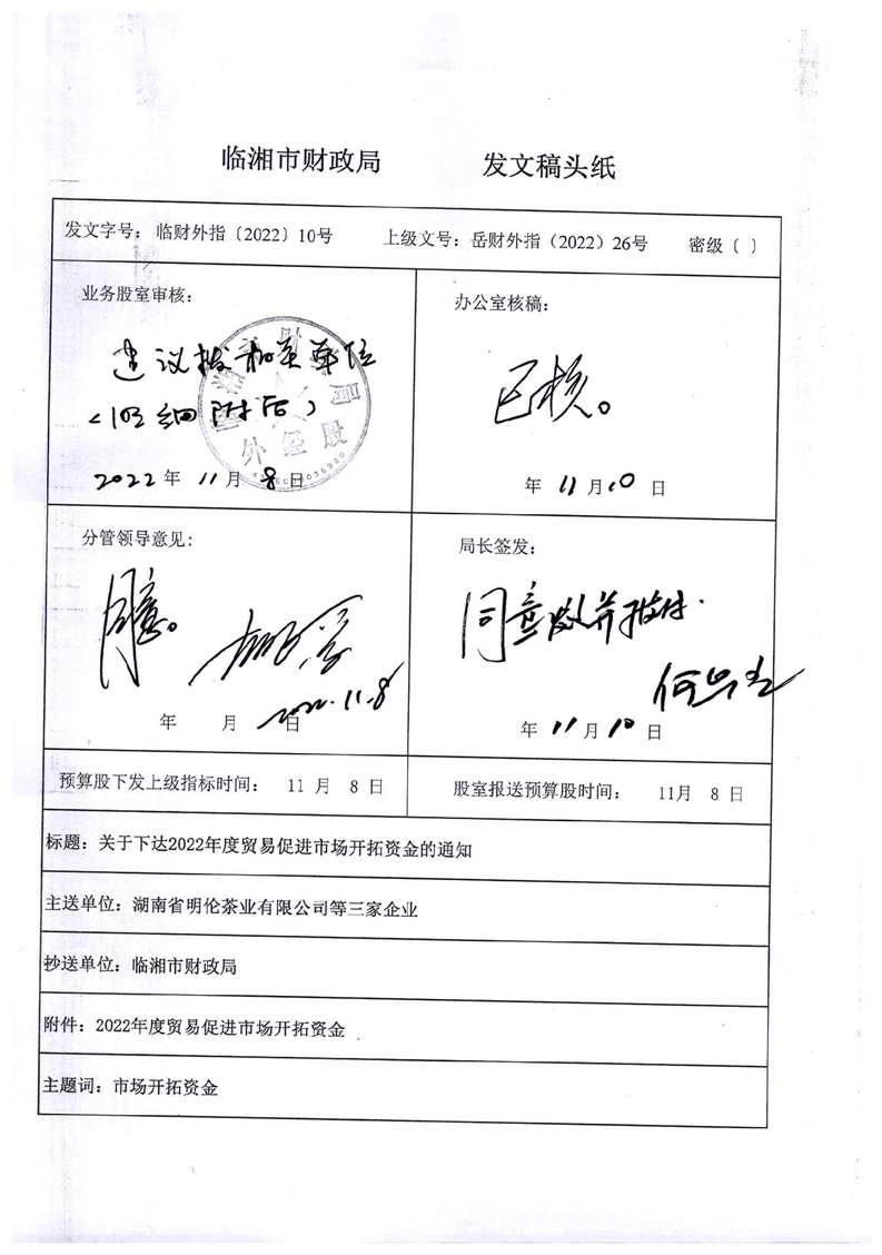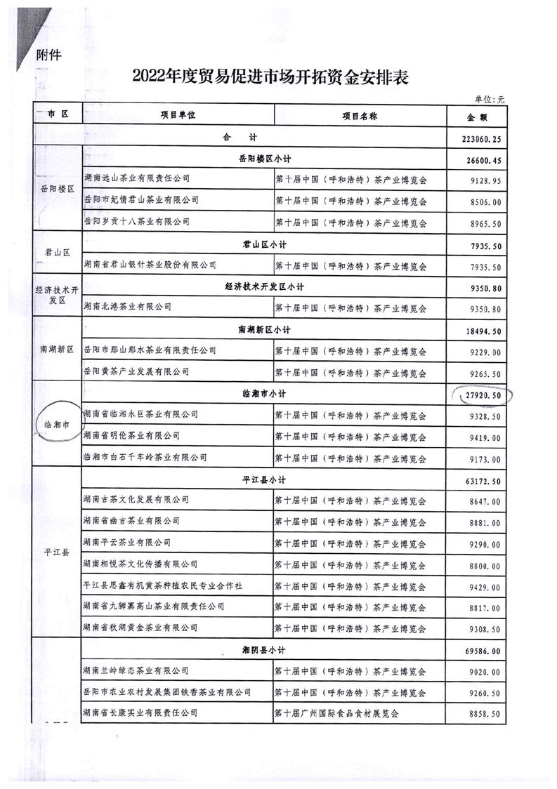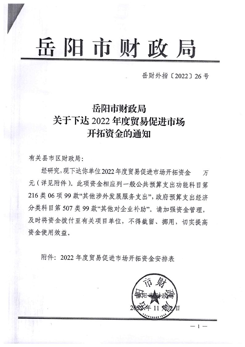 岳阳市财政局关于下达2022年度贸易促进市场开拓资金的通知