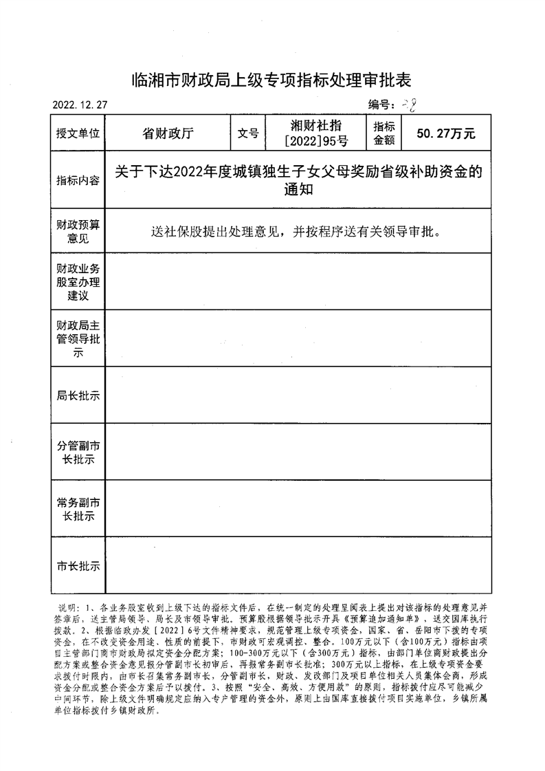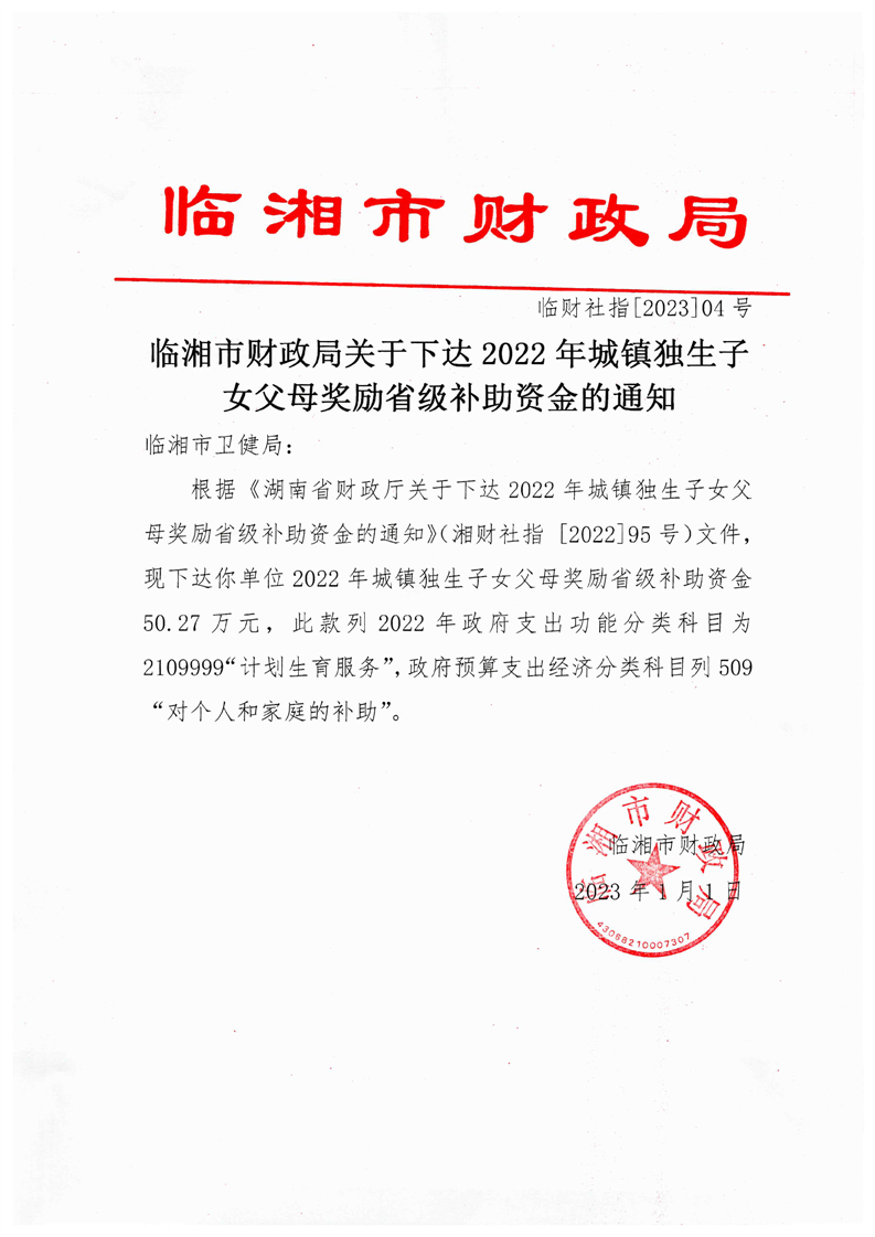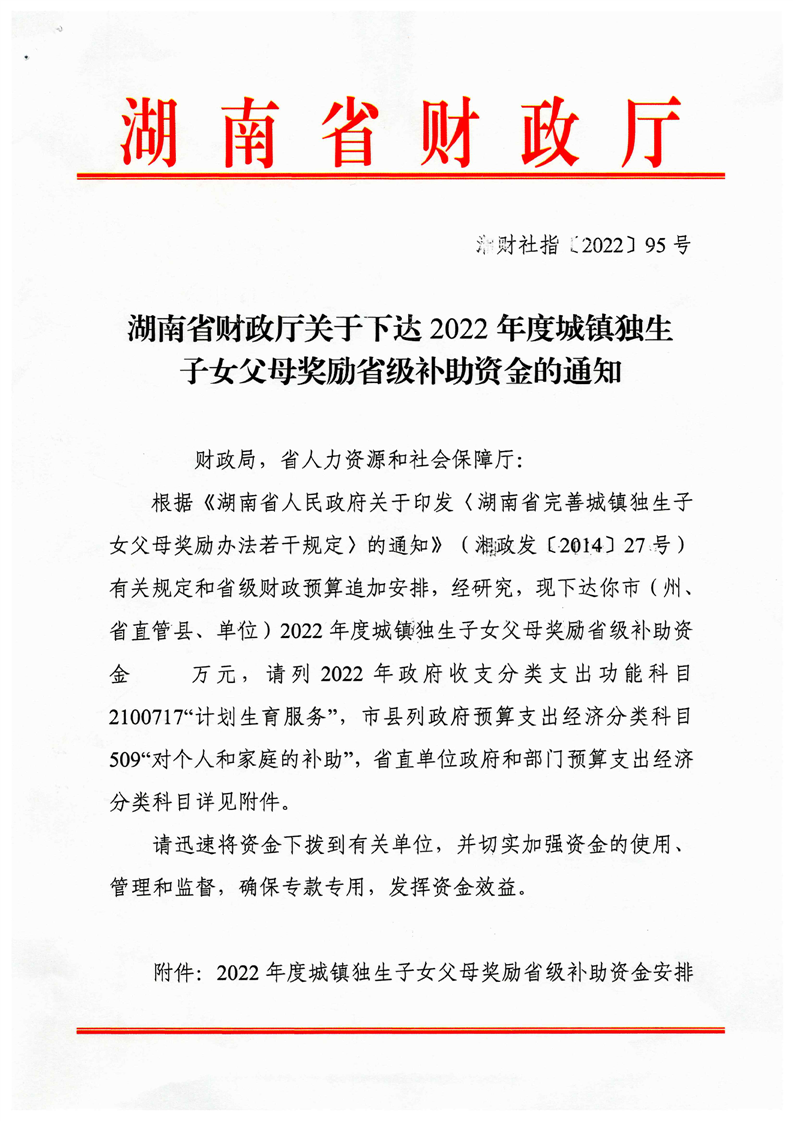 关于下达2022年城镇独生子女父母奖励省级补助资金的通知
