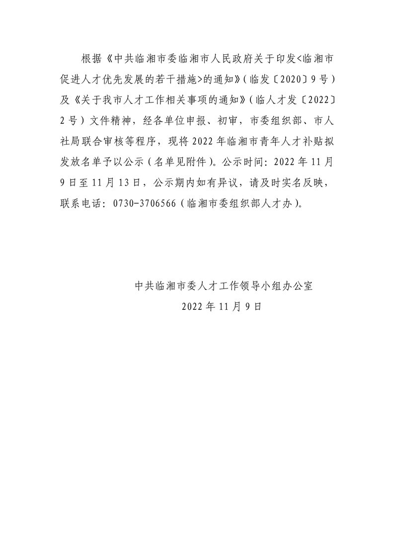 2022年临湘市青年人才补贴拟发放名单公示